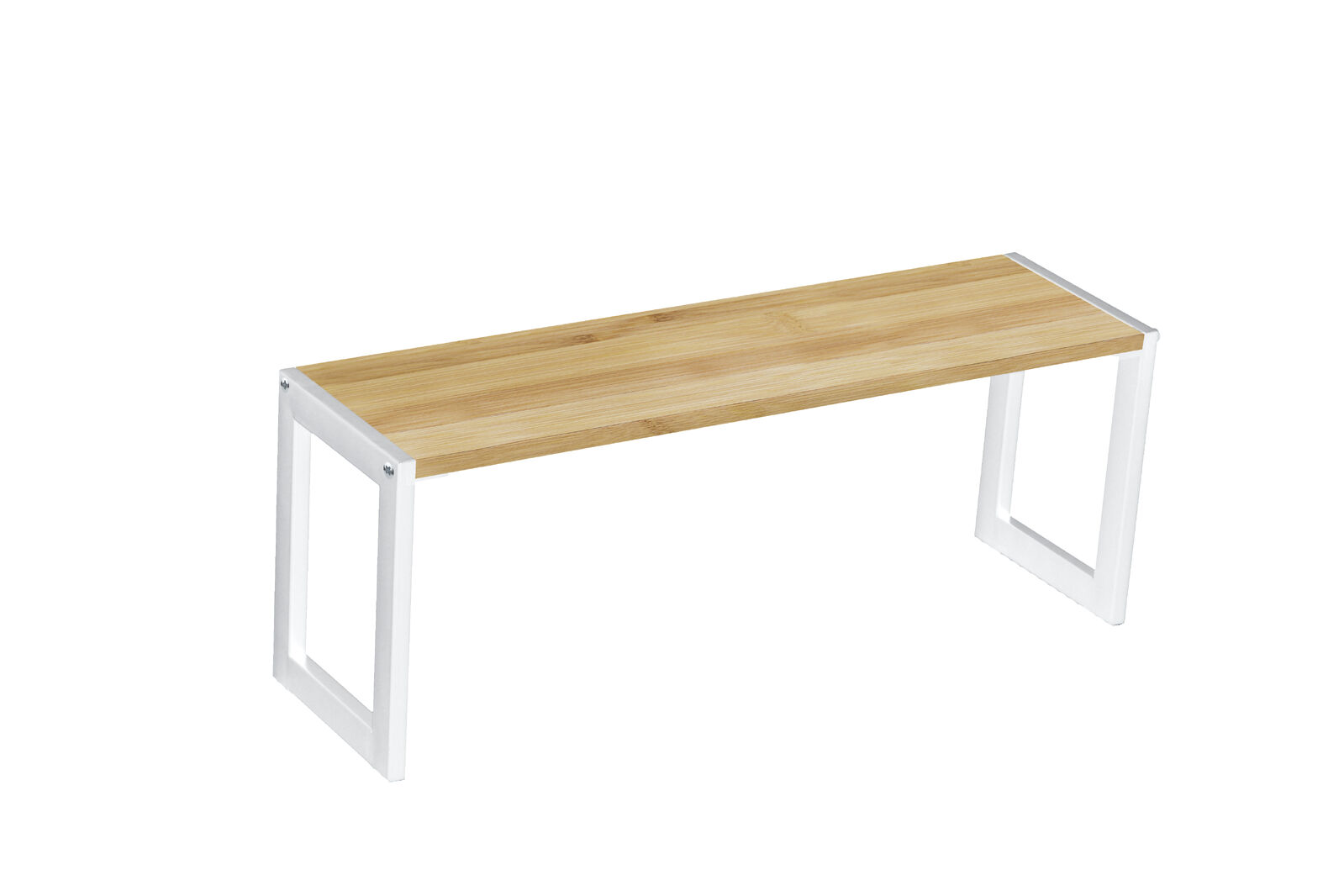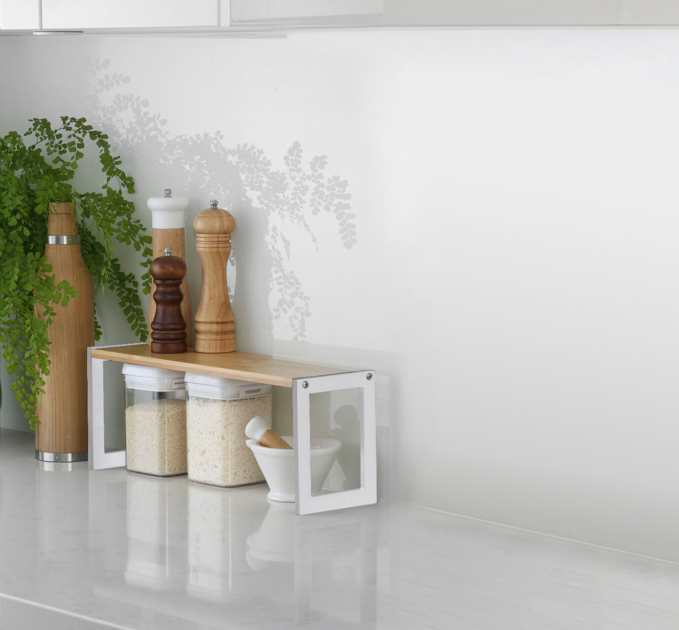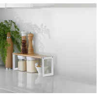 Maximize your kitchen storage with the Narrow Stackable Bamboo Kitchen Shelf in White.