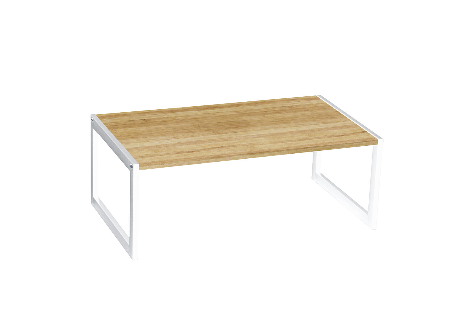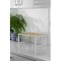 This stylish and practical shelf combines natural bamboo with sleek matte white powder-coated steel, adding a modern touch to your kitchen.