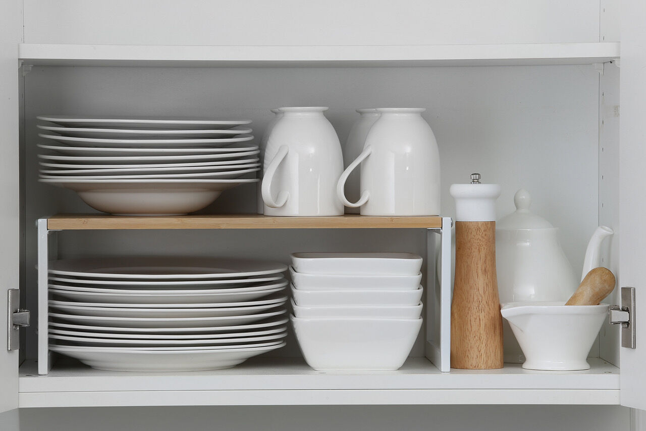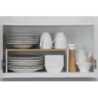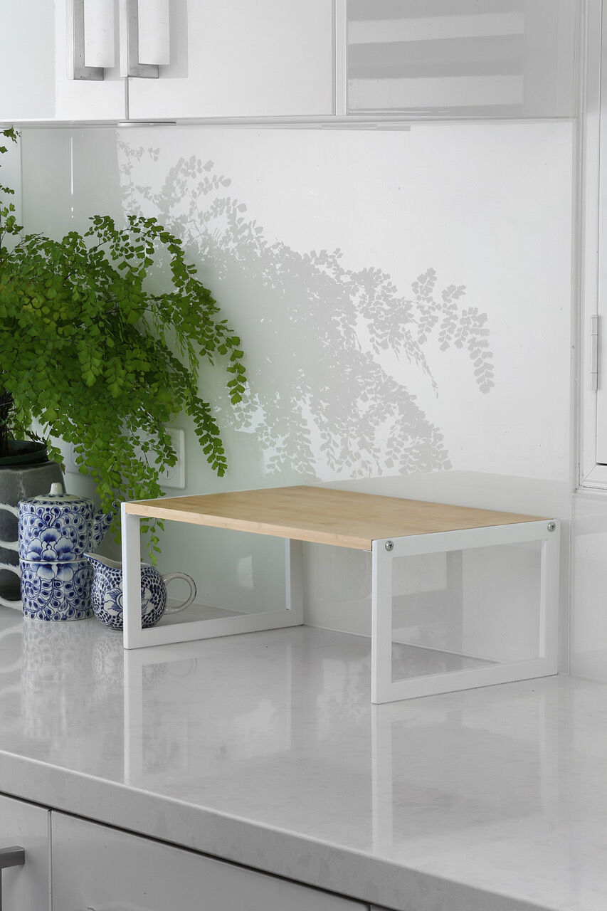 Maximize your kitchen storage with the Deep Stackable Bamboo Kitchen Shelf in White.