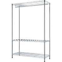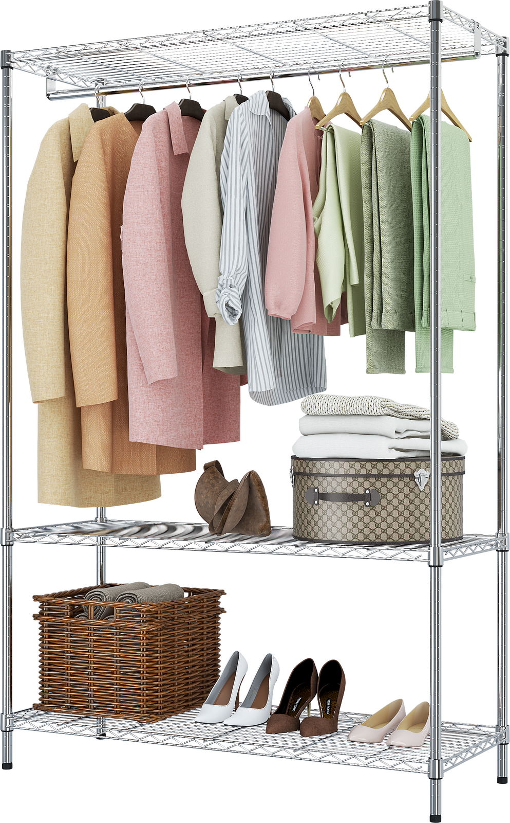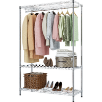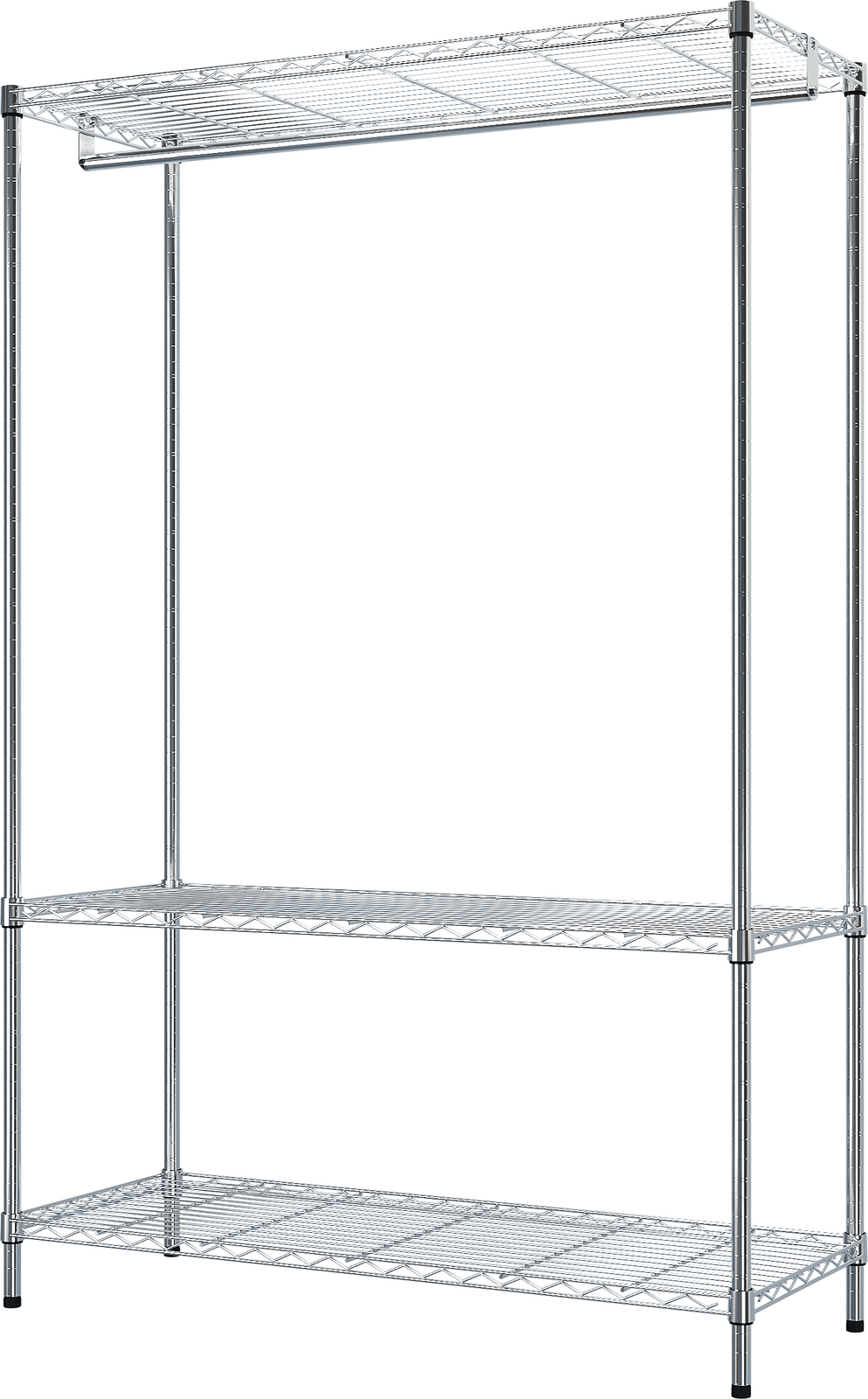The unit features a chrome hanging rail and three adjustable shelves that can be set at any height along the metal poles, allowing for versatile storage.